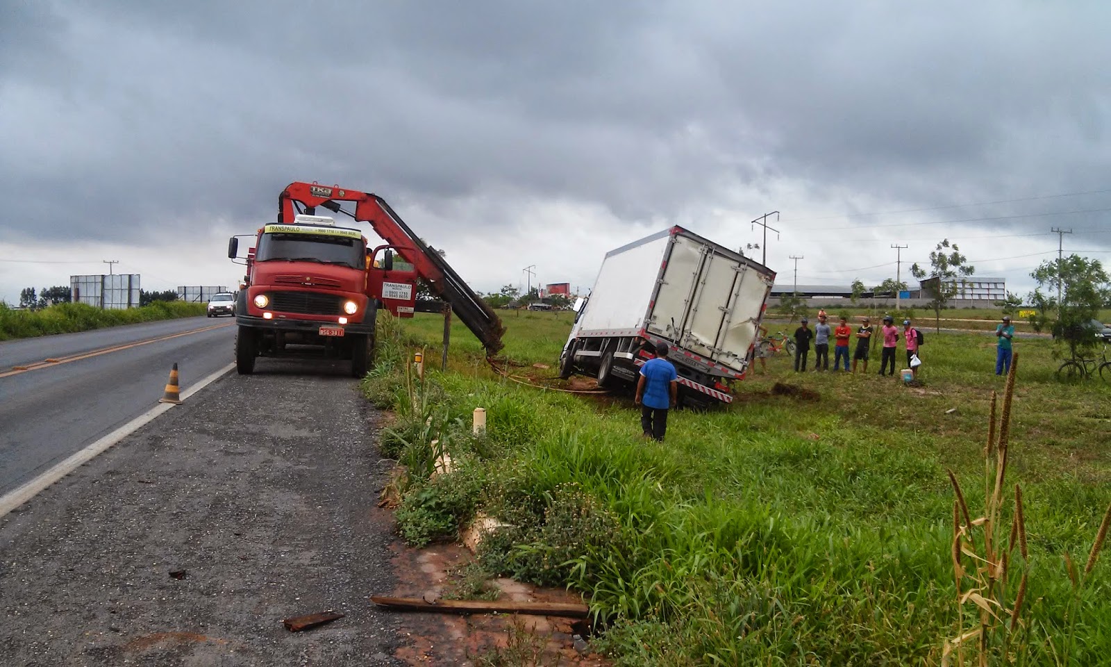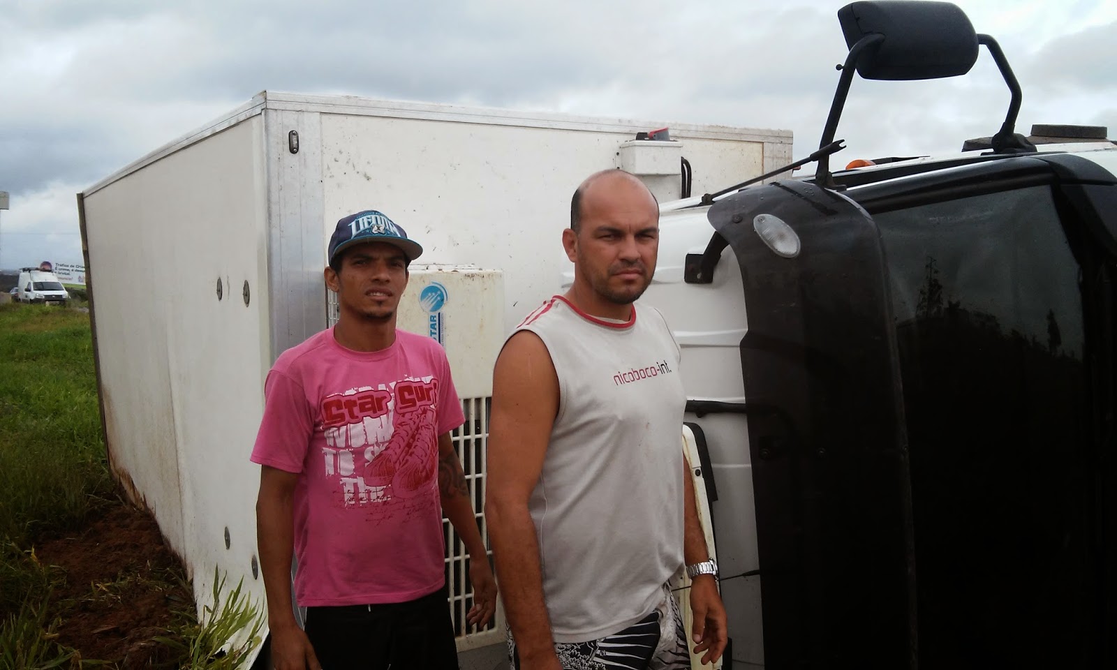 O motorista ainda tentou frear o caminhão, mas com a pista molhada ele acabou tombando as margens da rodovia.